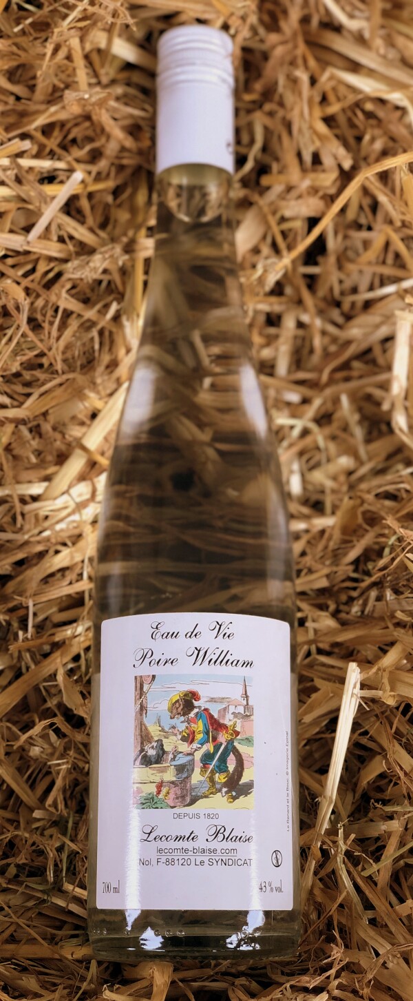 Lecomte Blaise - Depuis 1820 La poire William est obtenue par la fermentation et la distillation du fruit. Il faut 25 kg pour obtenir un litre d'alcool pur. C'est une eau de vie fine et charmeuse avec un nez très parfumé et un palais fruité très caractéristique. L'eau de vie se consomme fraîche ou glacée. On peut l'utiliser aussi en dessert ou en cocktail. Alc. 43 % vol. Contenance : 70 cl Déconseillé chez la femme enceinte.