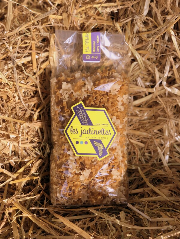 Les Malfadines - Malfadine Curry | Nature 100 % Lorrain Poids net : 450 gr Temps de cuisson : Quatre à six minutes Produits à partir des céréales cultivées sur notre exploitation agricole certifiée Haute Valeur Environnementale (H.V.E.)