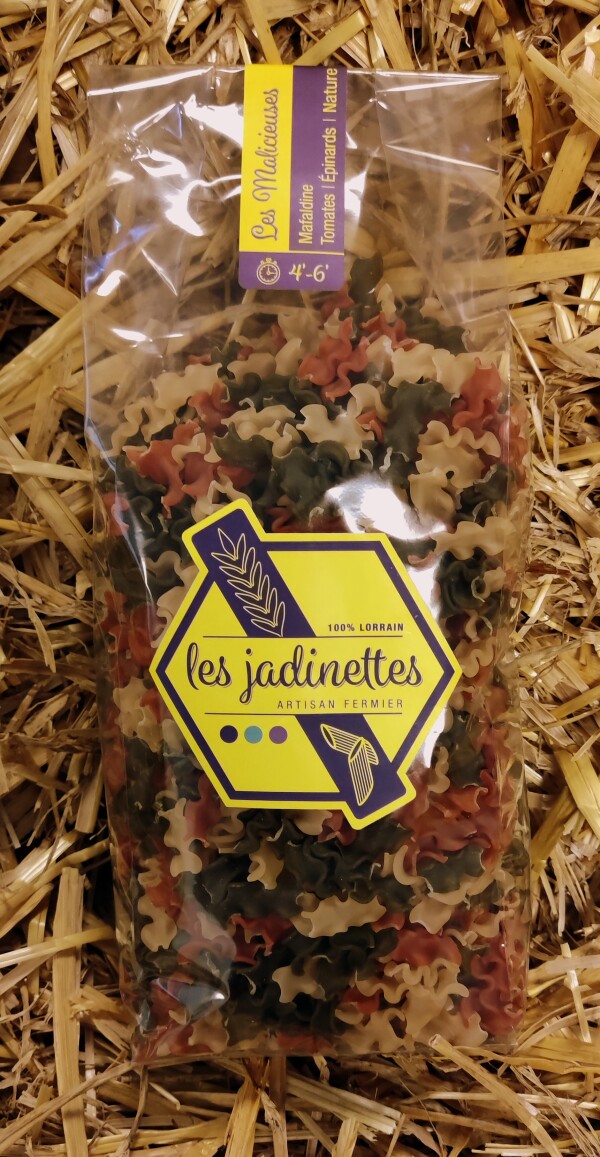 Les Malfadines - Mafaldine Tomates | Epinards | Nature 100 % Lorrain Poids net : 450 gr Temps de cuisson : Quatre à six minutes Produits à partir des céréales cultivées sur notre exploitation agricole certifiée Haute Valeur Environnementale (H.V.E.)