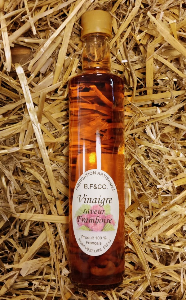 Vinaigre de vin blanc 6°, framboise 5 %, arôme saveur framboise, antioxydant E220.