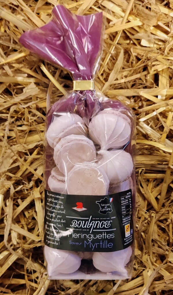 Sucre (UE et non UE), blanc d’œuf pasteurisé, myrtilles (UE et non UE) 7%, blanc d’œuf séché, sirop de sucre inverti, arôme naturelle de myrtille avec d’autre arôme naturel 0.4%, colorant carmin cochenille E120. Allergène : œuf.