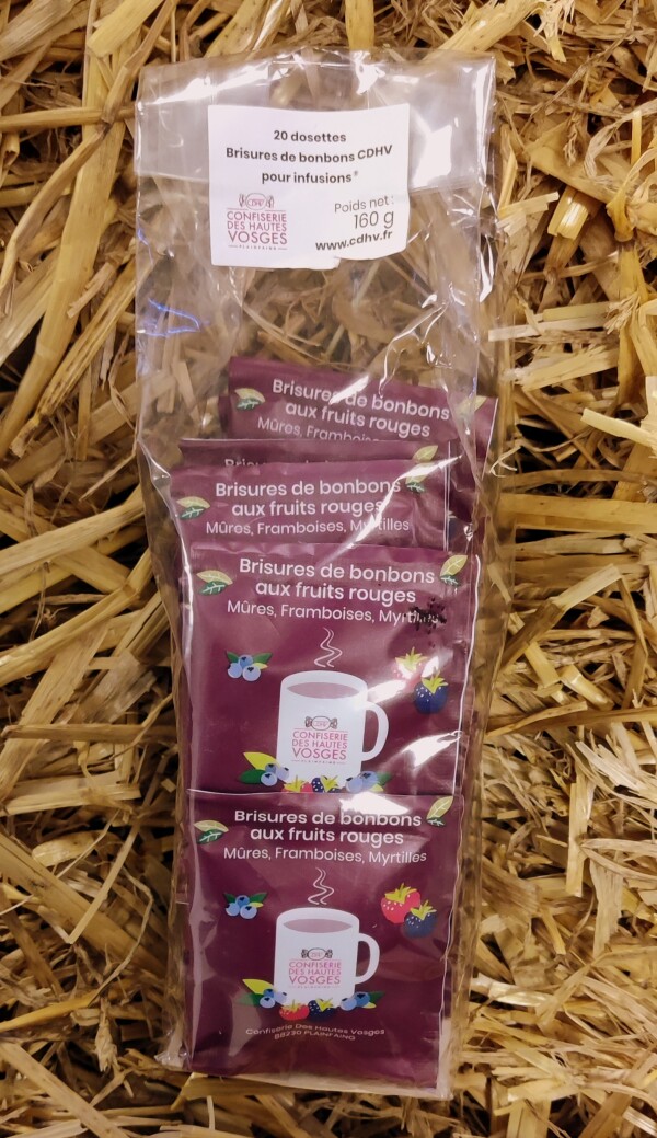 Informations nutrionnelles pour 100 gr : Energie : 1641 kJ / 386 kcl Matières grasses : < 0,5 gr dont acides gras saturés : < 0,01 gr Glucides : 96,5 gr dont sucres : 66,6 gr Protéines : < 0,5 gr Sel : 0,0153 gr Confiserie Des Hautes Vosges S.A.S. 88230 PLAINFAING - FRANCE