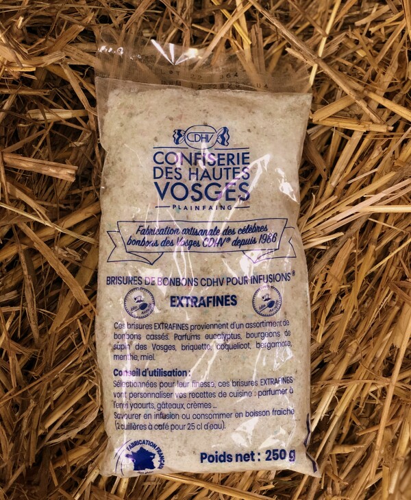 Informations nutritionnelles moyennes pour 100 gr : Energie : 1642 kJ / 386 kcal Matières grasses : < 0,5 gr dont acides gras saturés : < 0,1 gr Glucides : 96 gr dont sucres : 67 gr Protéines : < 0,5 gr Sel : 0,01 gr Bonbons fabriqués et emballés par C.D.H.V. - Confiserie Des Hautes Vosges S.A.S. 88230 PLAINFAING - FRANCE